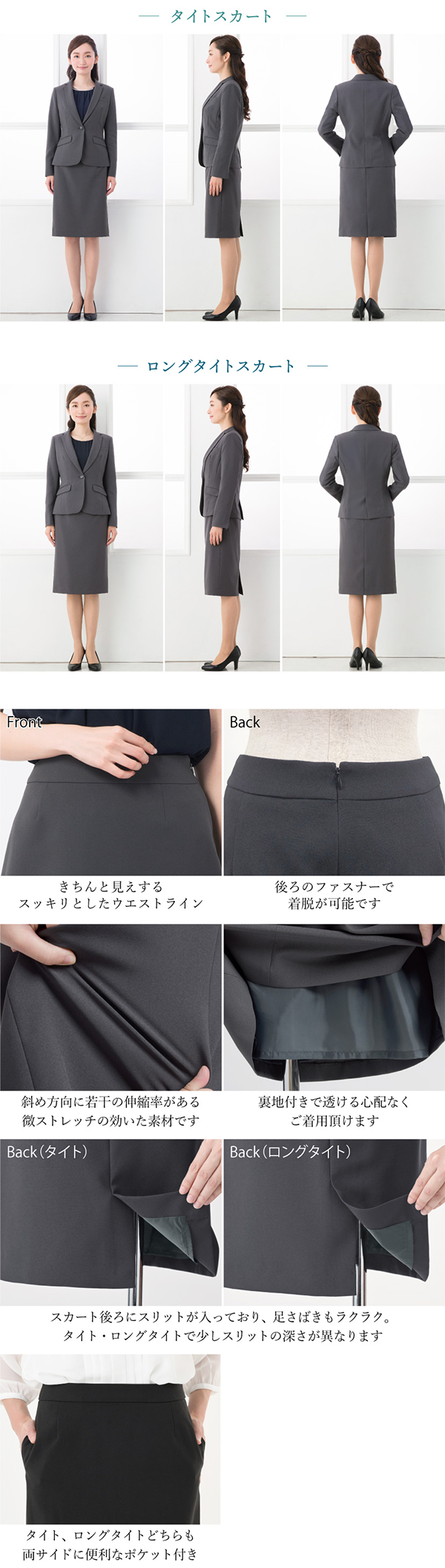 - 女性らしいフレア、ビジネスシーンにマッチするタイト、トレンドのロング丈タイト、脚さばきの良いタックデザインの4種類からお選びいただけます。