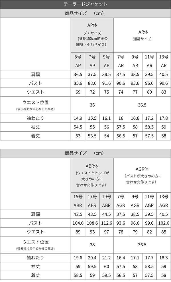 - 小柄な方やゆったりサイズをお求めな方へオススメなサイズ展開を取り揃えているほかジャケットの胸の開きが気になる方のために、バスト部分にゆとりを持たせた立体設計のAGR体も用意しました。