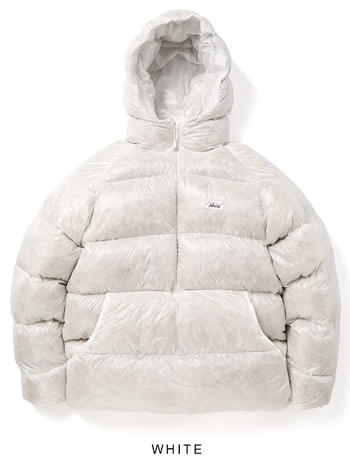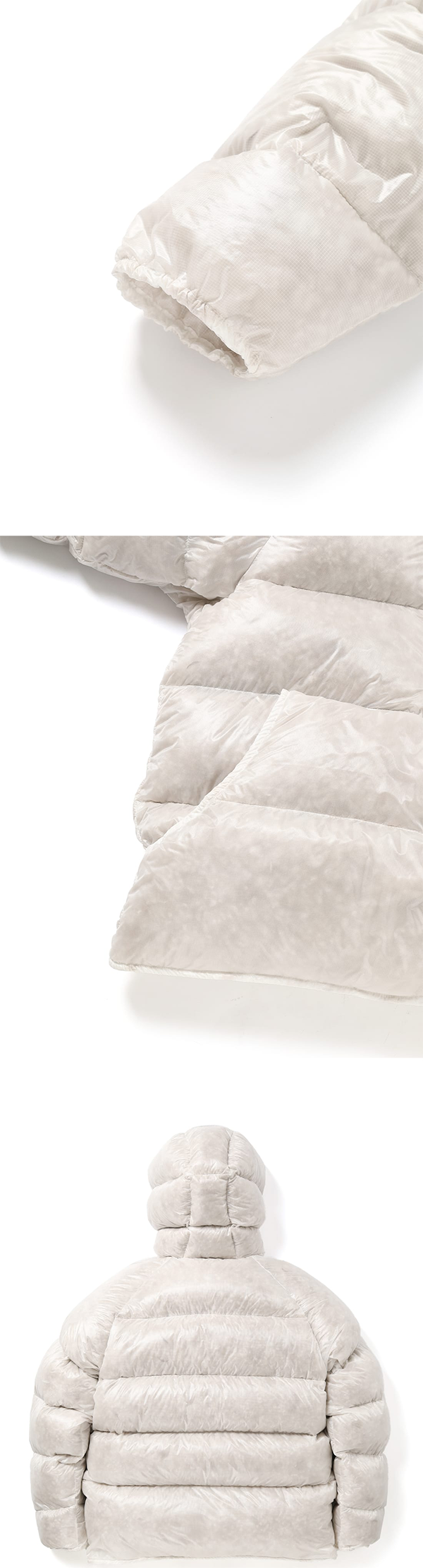 - ホワイト一色の生地の透け感を活かし、ダウンの質感や膨らみを視覚的に楽しめる「スケルトン」な見た目が特徴です。