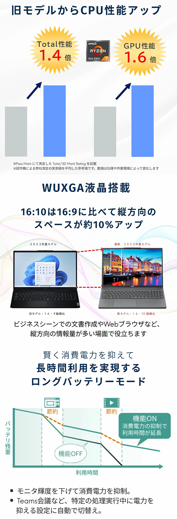 - 15.3型ワイドWUXGA(1920×1200ドット、16:10)ディスプレイを搭載しており、フルHDよりも縦方向の表示領域が広くなっています。