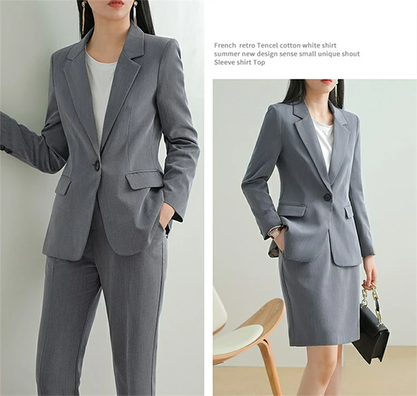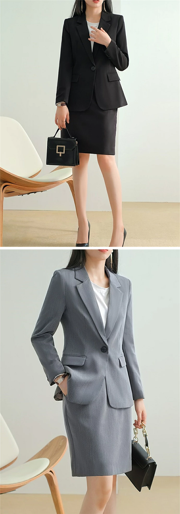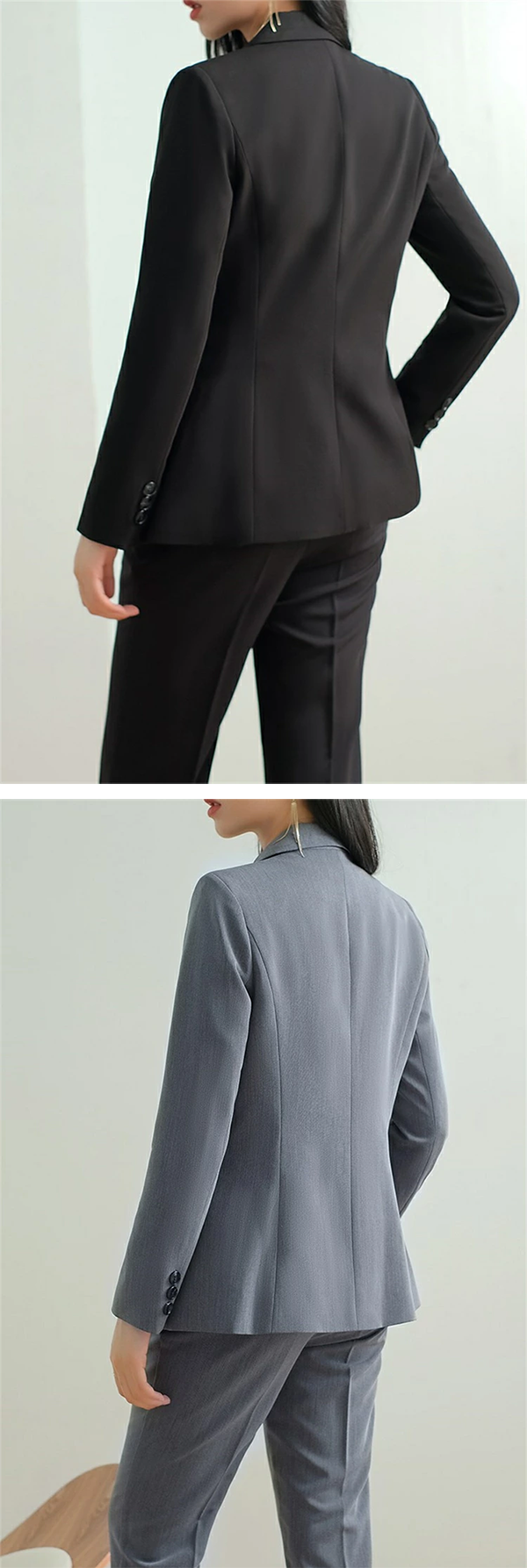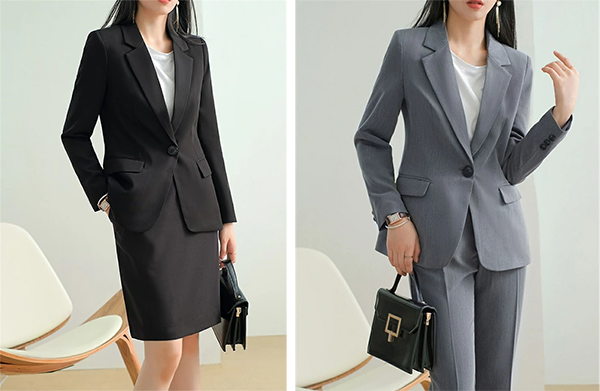 - 一つボタンのジャケットとタイトスカートかパンツのセットです。