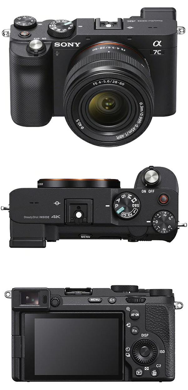- ソニーのミラーレス一眼カメラ「α7C」と標準ズームレンズ「FE 28-60mm F4-5.6」は、世界最小・最軽量のフルサイズシステムを実現する組み合わせです。