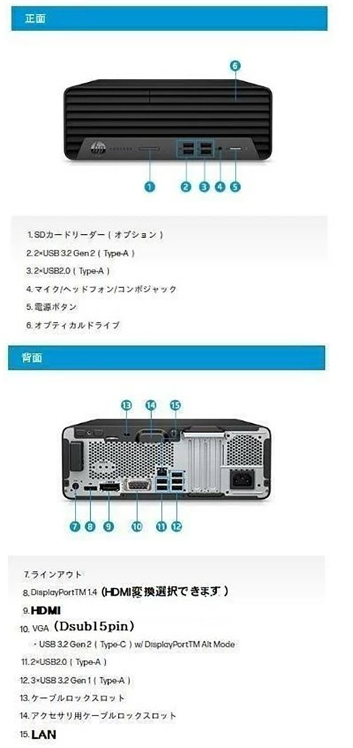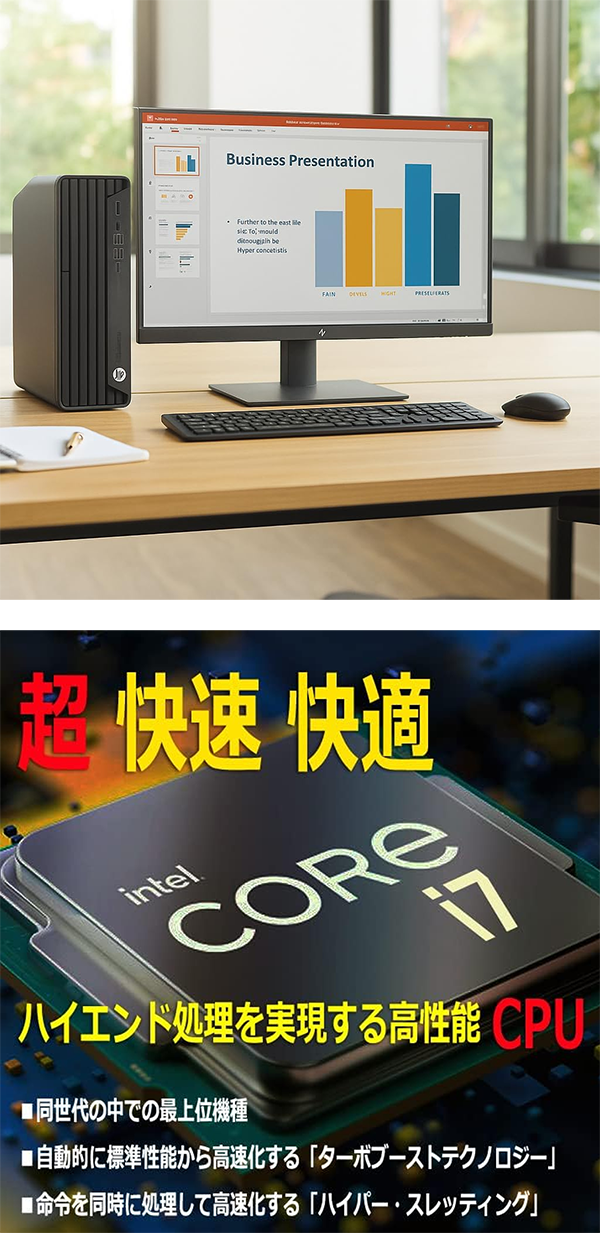 - HP ProDesk 400 G7 SFFは、Intel第10世代Core i5-10500を搭載し、Windows 11に対応しており、複数のメモリ・SSD構成および3画面出力をサポートしています。