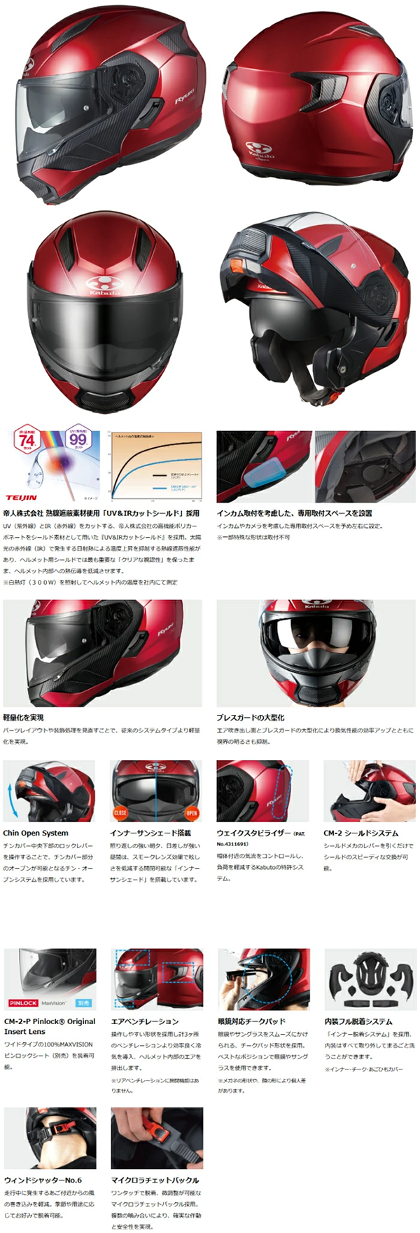 - 「CM-2-P UICシールド」を標準装備しており、紫外線 (UV) を約99%、赤外線 (IR) を約74%カットし、ヘルメット内部の温度上昇を抑えます。