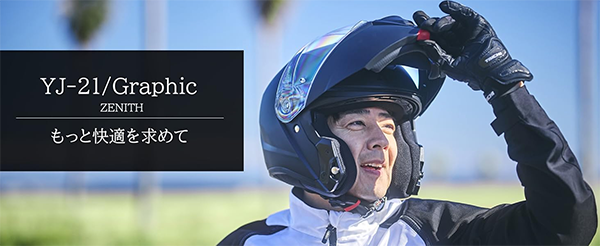 - YJ-21 ZENITHは、フリップアップ機能による利便性と、フルフェイスのようなスタイリッシュな外観を両立したモデルです。