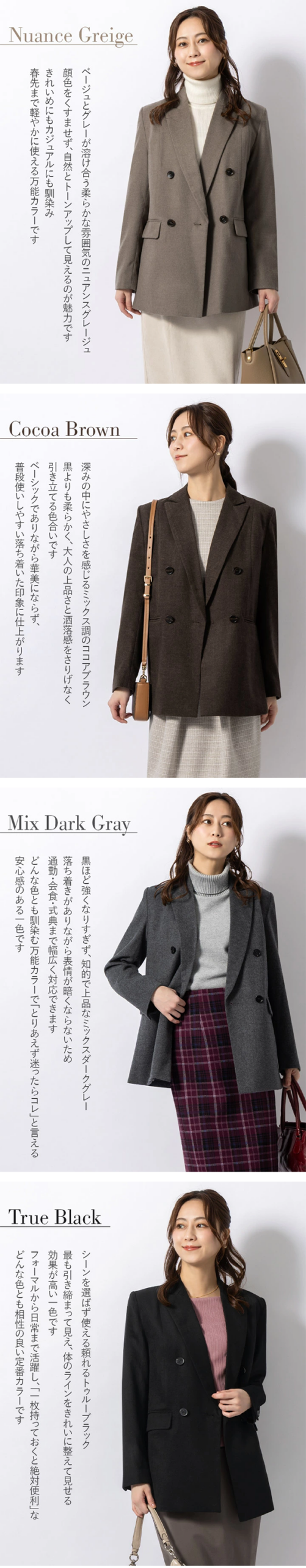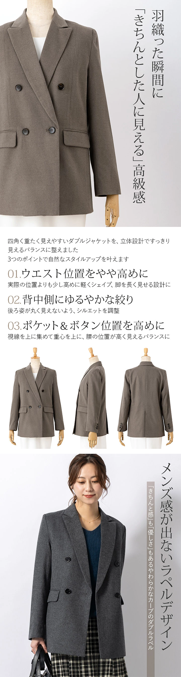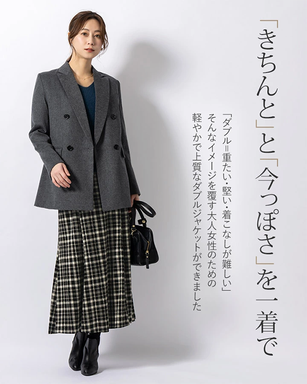 ▶ 体のラインをきれいに見せる美シルエットと、上品なウール混紡素材が特徴のジャケット