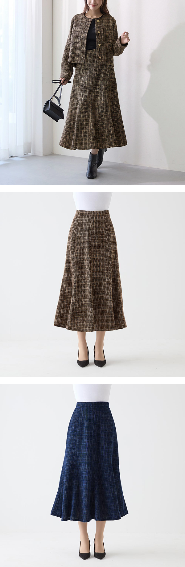 - ミックス感のある太番手のツイード素材を使用しており、上品なフレアシルエットが特徴です。