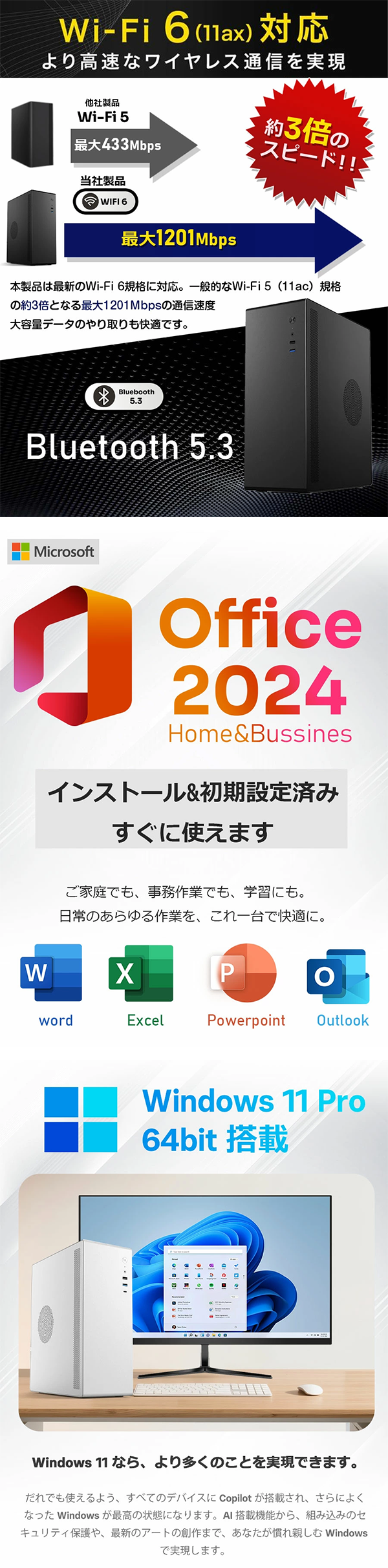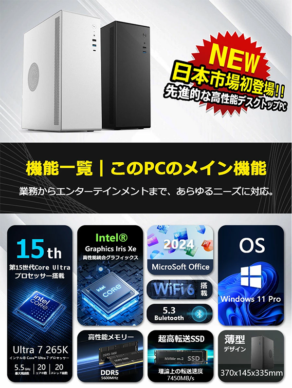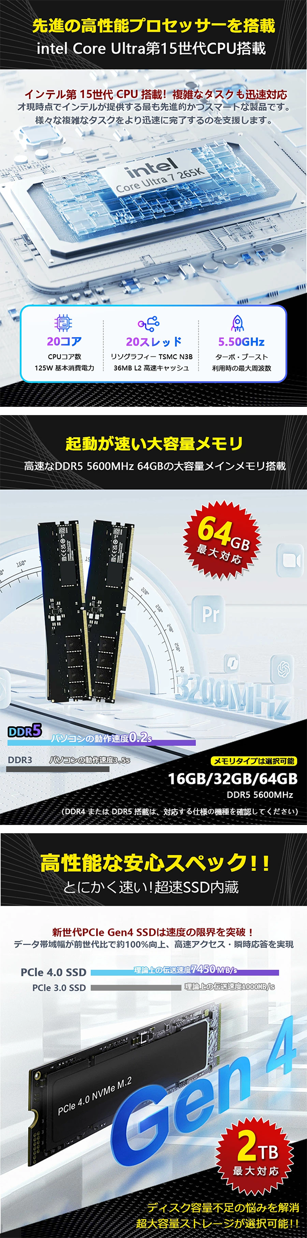 Toggle【商品の説明】新品 デスクトップパソコン PC LIZ-PC V10 Windows11 CPU 15世代 Core ultra 5-225 ultra 5-245K ultra 7-265K メモリ 16/32/64GB SSD 256GB / 512GB / 1TB / 2TB 無線LAN モニター なし Microsoft Office 2024