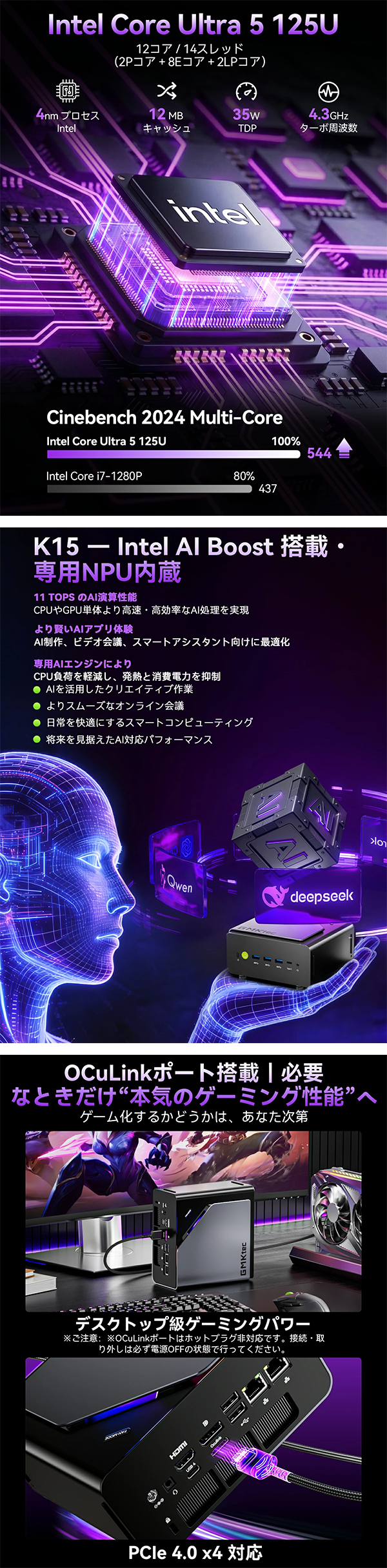 - GMKtec NucBox K15は、最新のIntel Core Ultra 5 125Uを搭載し、高い拡張性とAI処理能力を備えた高性能ミニPCです。