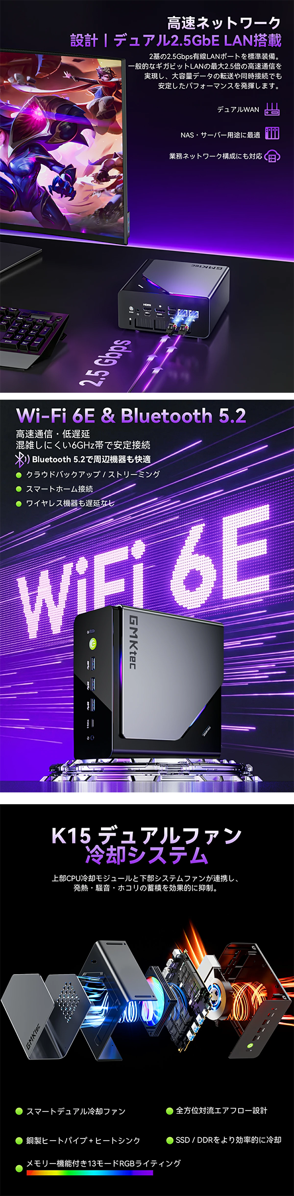 - 業務用途に最適な2.5Gbps LANポートを2基搭載。Wi-Fi 6E(6GHz帯)とBT5.2にも対応し、低遅延・高速通信環境を構築可能。複数デバイスの接続、NAS・サーバー用途、在宅ワークでも安定性抜群。