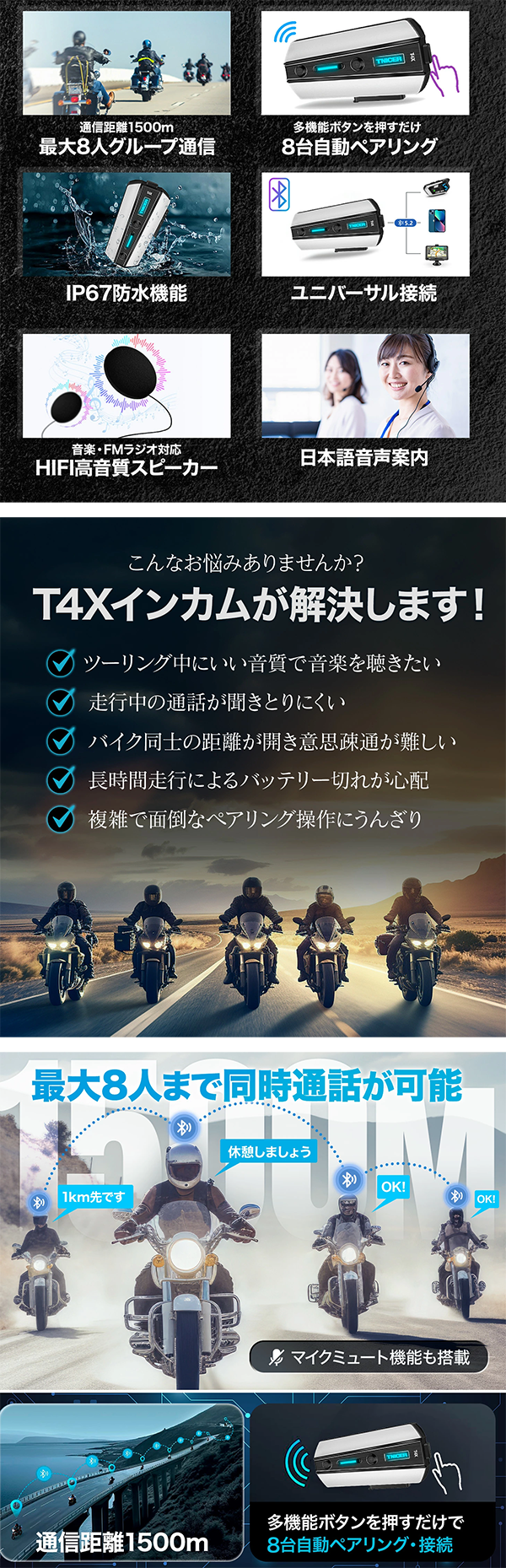◎バイク インカム 通信 ヘルメット装着 8台接続 T4X TNICER