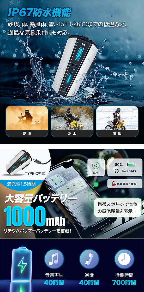 - 1000mAh大容量電池を内蔵し、連続インターコム通話時間最大28時間、音楽連続再生時間最大33時間、待機時間が最大360時間に達します。