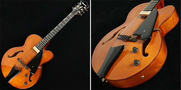- スプルース材のトップと、美しい木目のフレイム・メイプル材をサイド&バックに採用。フル・サイズのフルアコ構造により、ふくよかな胴鳴りを実現しています。