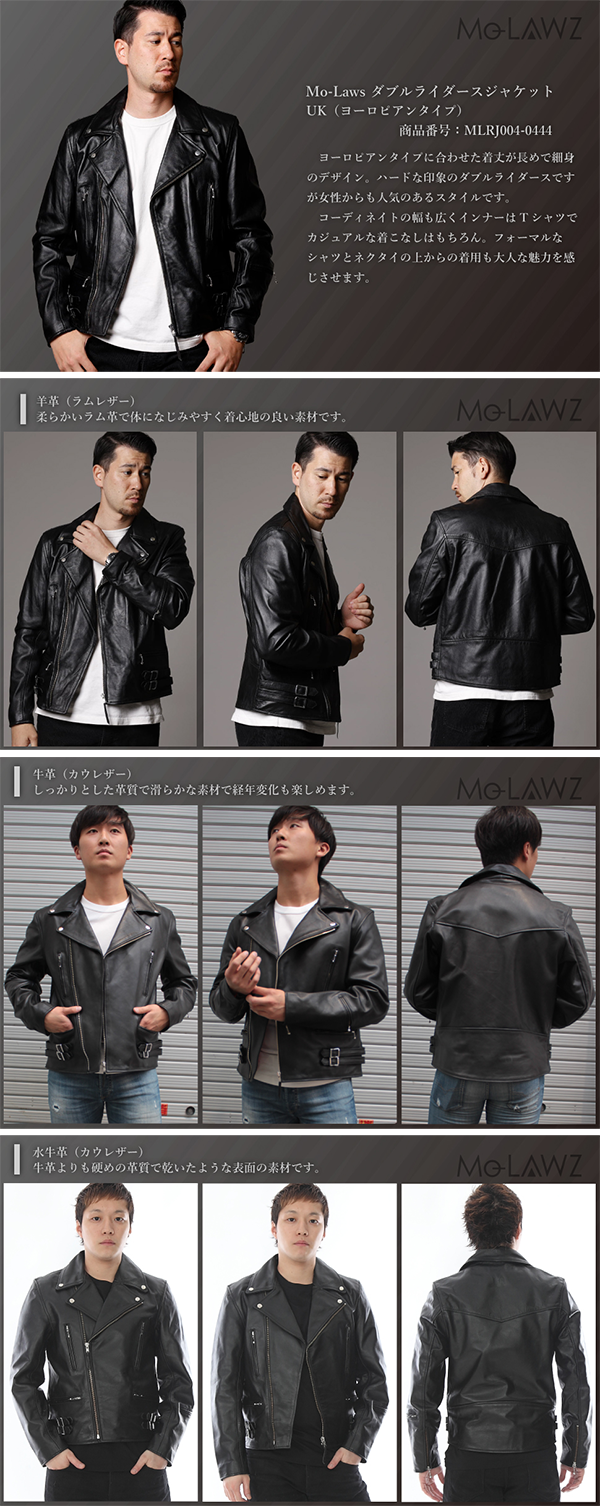 - 「皮の但馬屋」が展開するMo-LAWS(モローズ)ブランドのUKタイプ・ダブルライダースジャケットは、パキスタンの工場から直接輸入することで中間マージンを省き、低価格かつ高品質な提供を実現しています。メンテナンス用のミンクオイルが付属するのが特徴です。