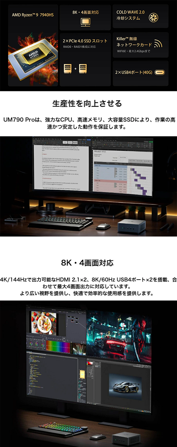 - MINISFORUM UM790 Proは、(AMD Ryzen 9 7940HS、32GBメモリ、512GBまたは1TB SSD、Wi-Fi 6E、4画面同時出力、Windows 11)を備えた高性能ミニPCです。