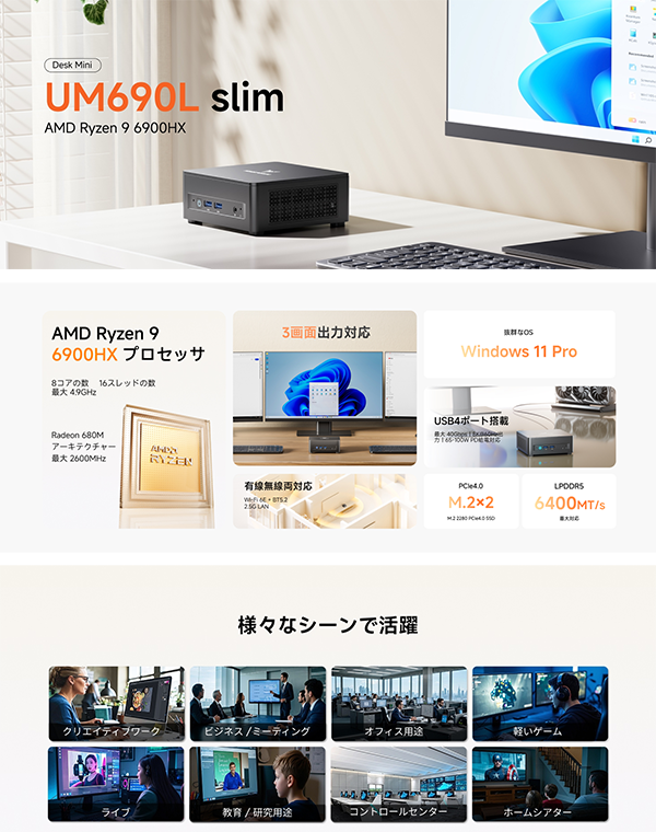 - Minisforum UM690L SlimミニPCは、高性能なAMD Ryzen 9 6900HXプロセッサーを搭載し、3画面出力やWi-Fi 6Eに対応した小型デスクトップパソコンです。