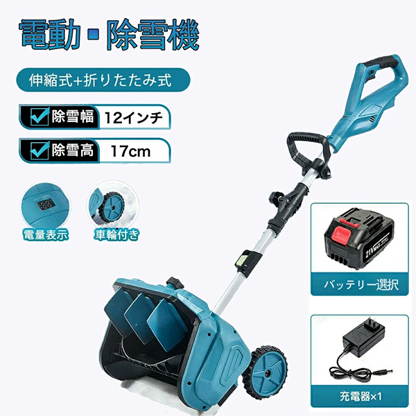 - 家庭用の充電式電動除雪機の型番です。軽量で取り回しが簡単で、手押し式で狭い範囲の雪かきに適しています。