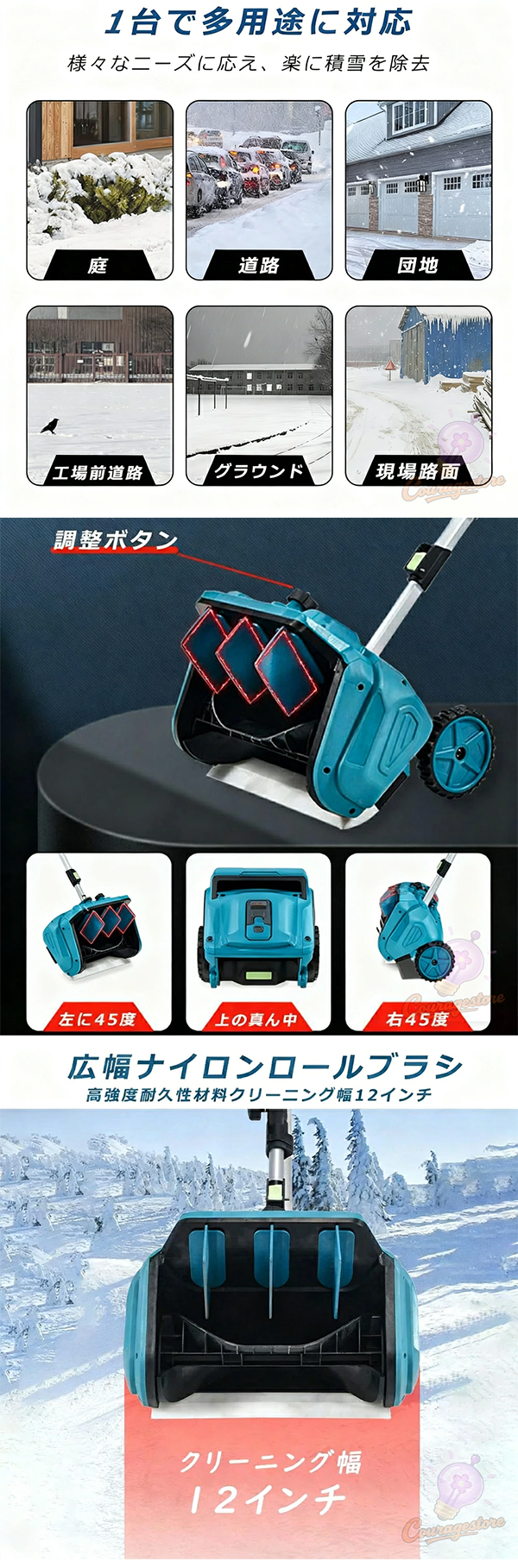 - 車道や歩道などの除雪を素早く行い、私道、歩道、小さな屋外エリアに最適で安全な通行を確保します。