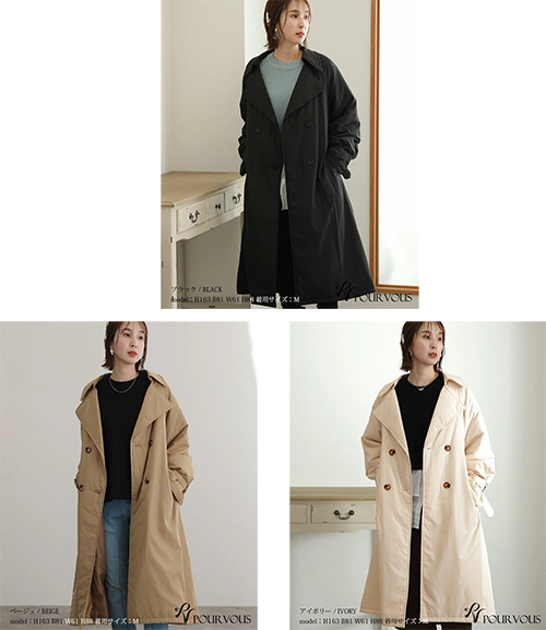 - 中綿入りのため、通常のトレンチコートよりも暖かく、秋から冬まで長い期間着用できます。