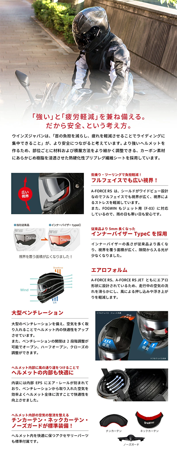 - ドライカーボンの採用により、長時間のライディングでも首や肩への負担が大幅に軽減されるよう設計されています。