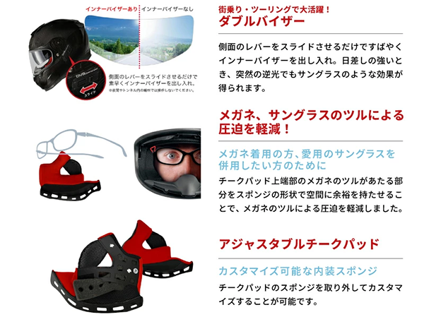 - インナーバイザー: スライド操作で出し入れ可能なサンバイザーを装備。