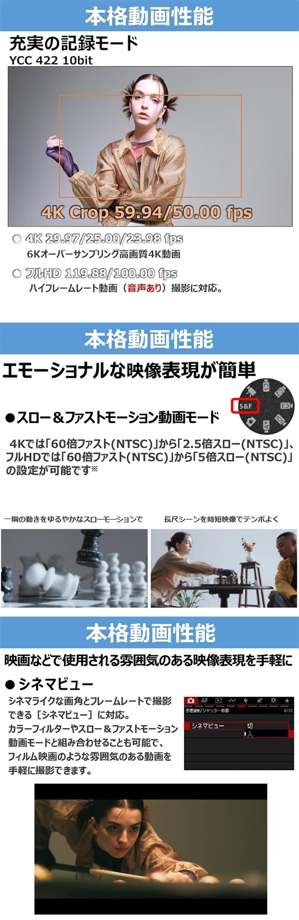 - 6Kオーバーサンプリングによる高精細な4K映像記録に対応しており、Vlogや動画配信に適した設計となっています。