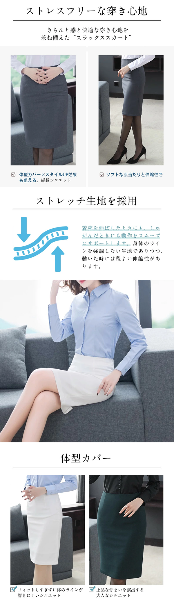▶ ビジネスから冠婚葬祭まで幅広く活用できるシンプルなデザインのタイトスカート