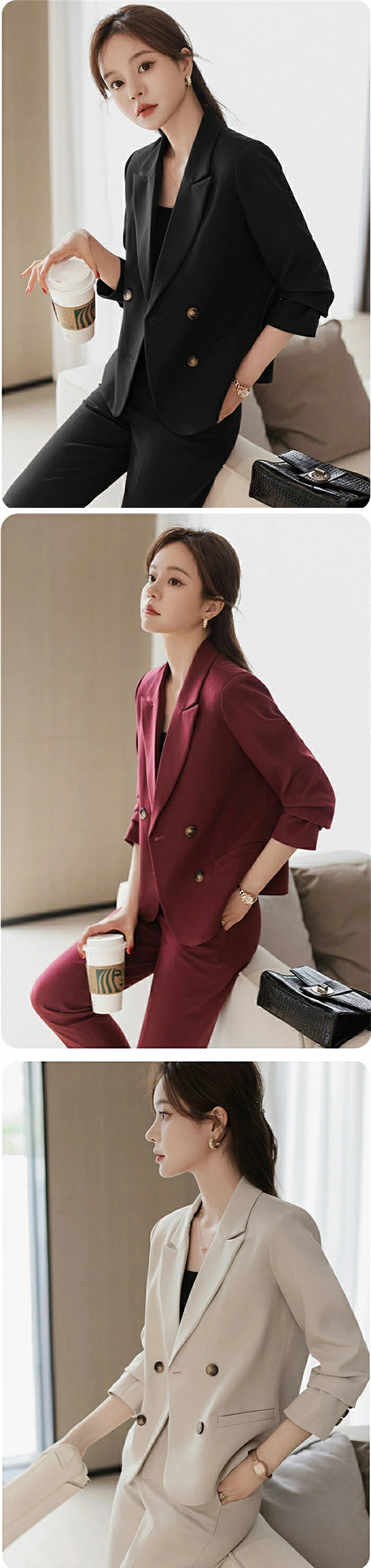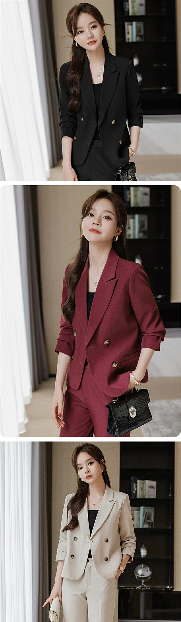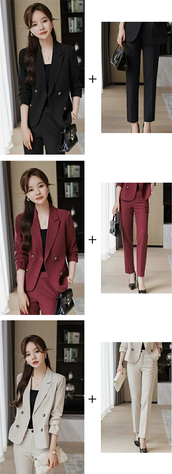 - スタイリッシュなショート丈ジャケットと、足元をすっきりと見せる九分丈のストレートパンツがセットになったビジネス・フォーマル向けのアイテムです。