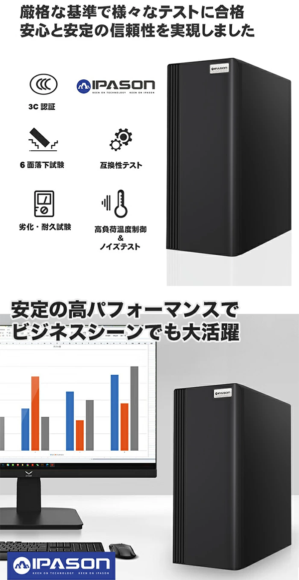 - IPASON SLIM シリーズは、デスク上でも場所を取らないスリムタワー型を採用しています。