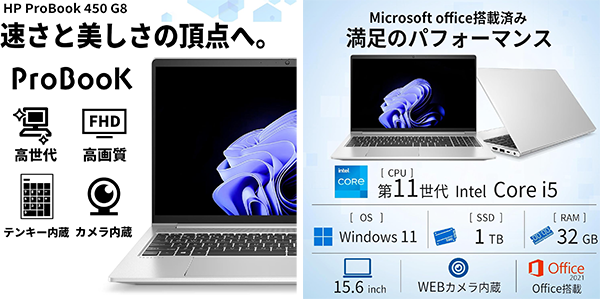 ▶ Amazonのサイト: 【整備済み品】HP ノートパソコン Probook 450 G8 15.6インチ Core i5-1135G7 第11世代 Windows11 Office 2021搭載 Wi-Fi6 type-C カメラ フルHD SSD 1TB メモリ 32GB
