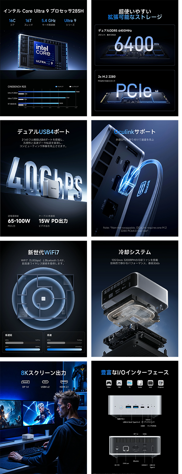 ▶ 【インテル Core Ultra 9 285H|OCulink|Copilot】MiniPC メモリ 32GB/64GB SSD 1TB/2TB