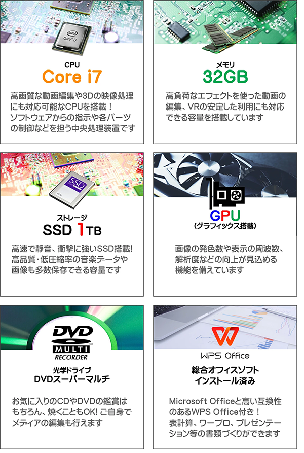 - 高い処理能力と大容量ストレージを兼ね備えたビジネス・クリエイティブ向けのデスクトップPCです。