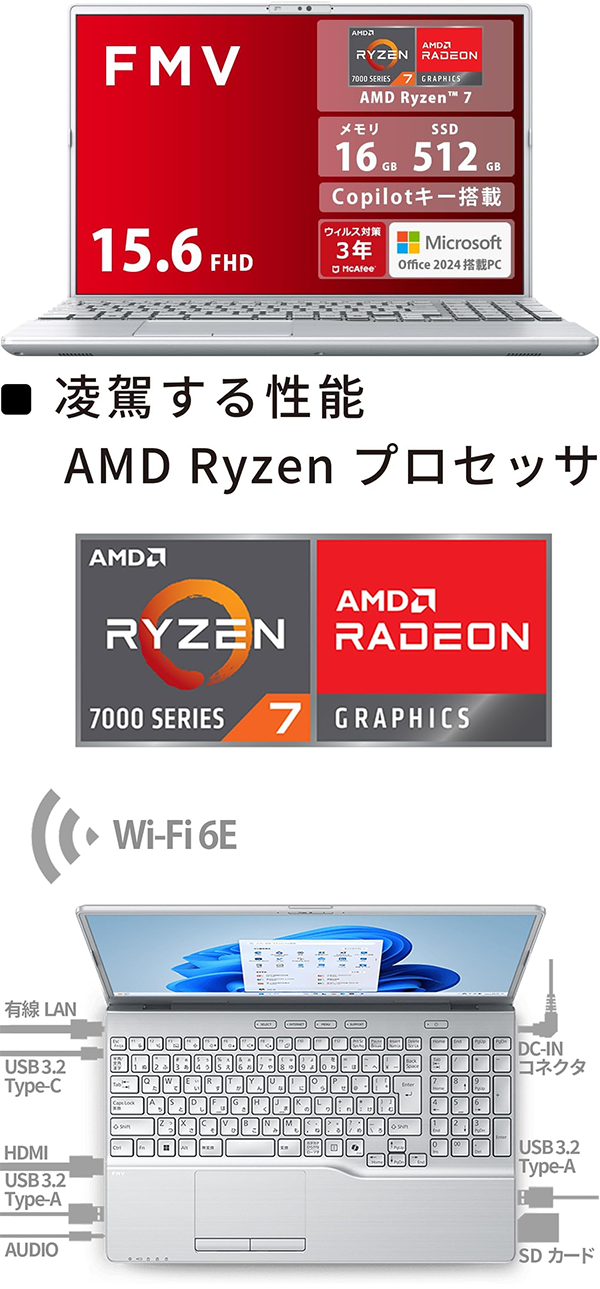 ■注目のおすすめの一台! 新品 富士通 ノートPC FMV Note A WA1-K3 AMD Ryzen7 7730U メモリ 16GB SSD 512GB Wi-fi6 Copilotキー 15.6型 Win 11 MS Office 2024