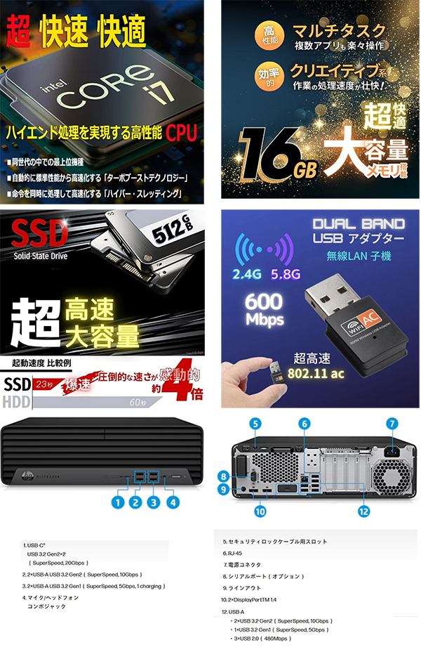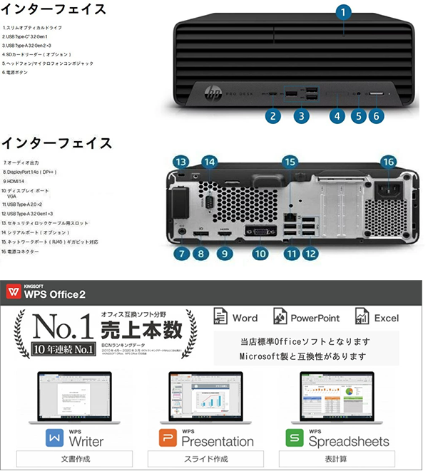 Toggle【商品の説明】中古 デスクトップパソコン PC HP EliteDesk 800 G8 SFF Windows11 CPU Intel 11世代 Core i7-11700 メモリ 16GB SSD 512GB 有線/無線LAN モニター なし WPS Office