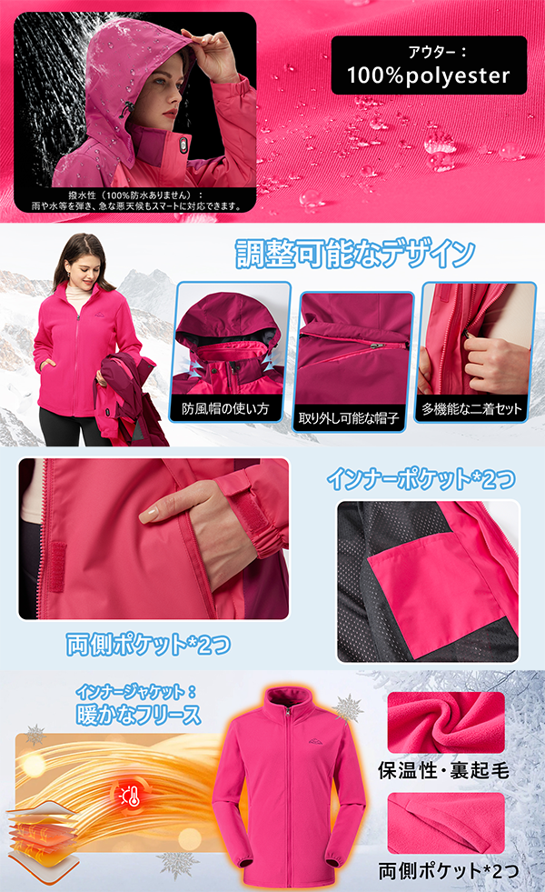 Toggle【商品の説明】レディース アウトドア 3in1 ジャケット マウンテンパーカー フード [TBMPOY]