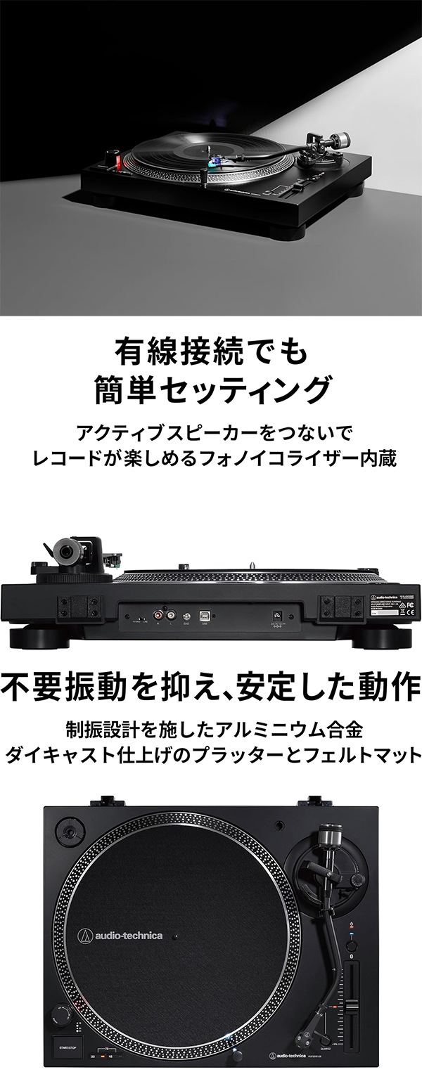 - オーディオテクニカの AT-LP120XBT-USB は、ダイレクトドライブ方式を採用したマニュアル操作のレコードプレーヤーです。