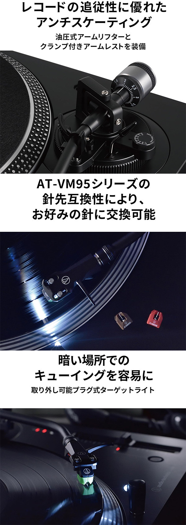 - 長年の技術を凝縮した交換できるVM カートリッジAT-VM95Eや、ヘッドシェルATHS6を内包しています。