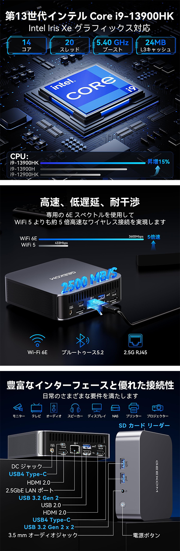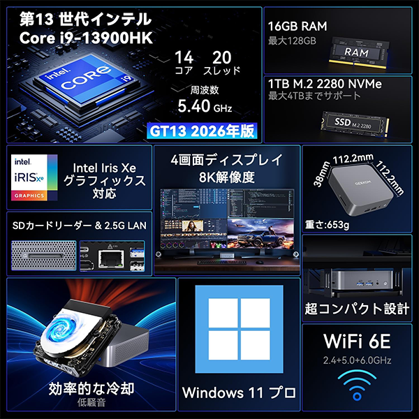 - GEEKOM GT13 Proは、第13世代のハイエンドCPU Intel Core i9-13900HKを搭載した、非常にコンパクトでパワフルなミニPCです。