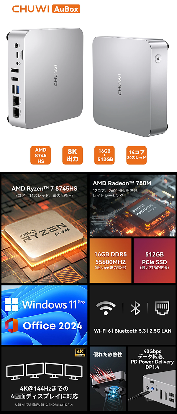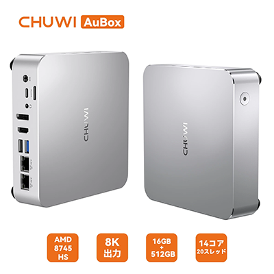 - CHUWI AuBox 8745HSは、高性能なAMD Ryzen 7 8745HSプロセッサを搭載し、4画面同時出力やOCuLinkなどの拡張性を備えたハイクラスなミニPCです。