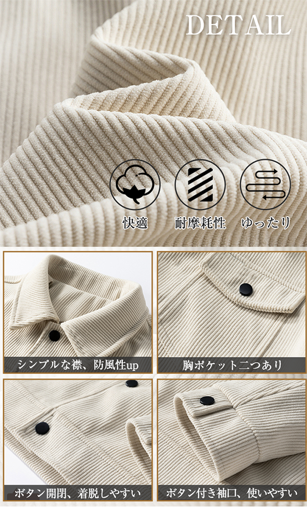 - 色は落ち着いた色を採用し、レトロなデザインとコーデュロイ特有の縦うねと光沢感を相まって、着るだけで自然な古着感を演出、同時にスタイリッシュに仕上がっています。
