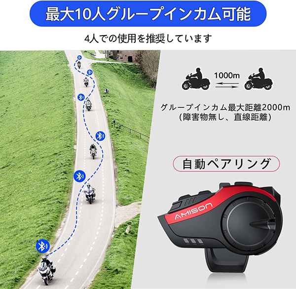 - Amison G10 バイクインカムは、最大10人までの同時通話に対応しており、Bluetooth 5.0による最大2,000mの通信距離を備えたコストパフォーマンスの高いモデルです。