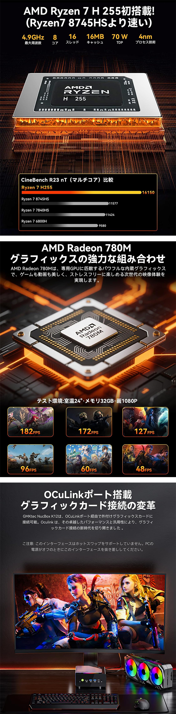 Toggle【商品の説明】新品 ミニデスクトップパソコン PC GMKtec K12 Windows11 CPU AMD Ryzen7 H255 メモリ 32GB SSD 512B 無線LAN Wi-Fi6E Oculink モニター なし 4画面同時出力