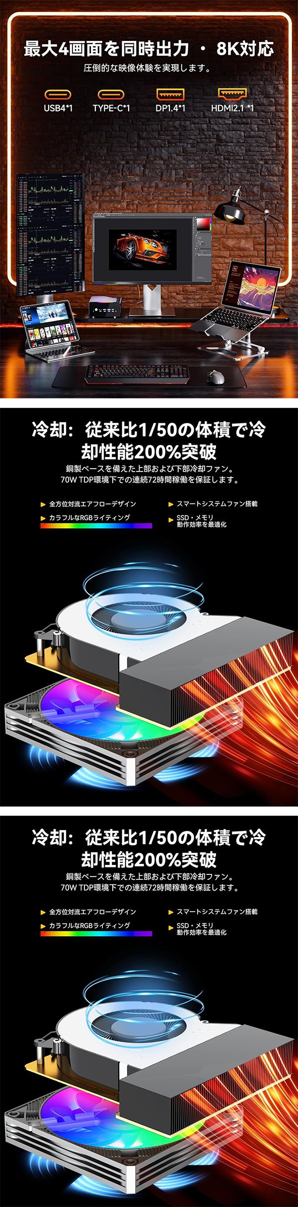 - 新世代のCPU「AMD Ryzen 7 H255」を搭載した高性能ミニPCです。