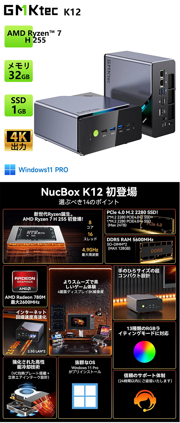 ▶ Amazonのサイト: 新品 ミニデスクトップパソコン PC GMKtec K12 Windows11 CPU AMD Ryzen7 H255 メモリ 32GB SSD 512B 無線LAN Wi-Fi6E Oculink モニター なし 4画面同時出力