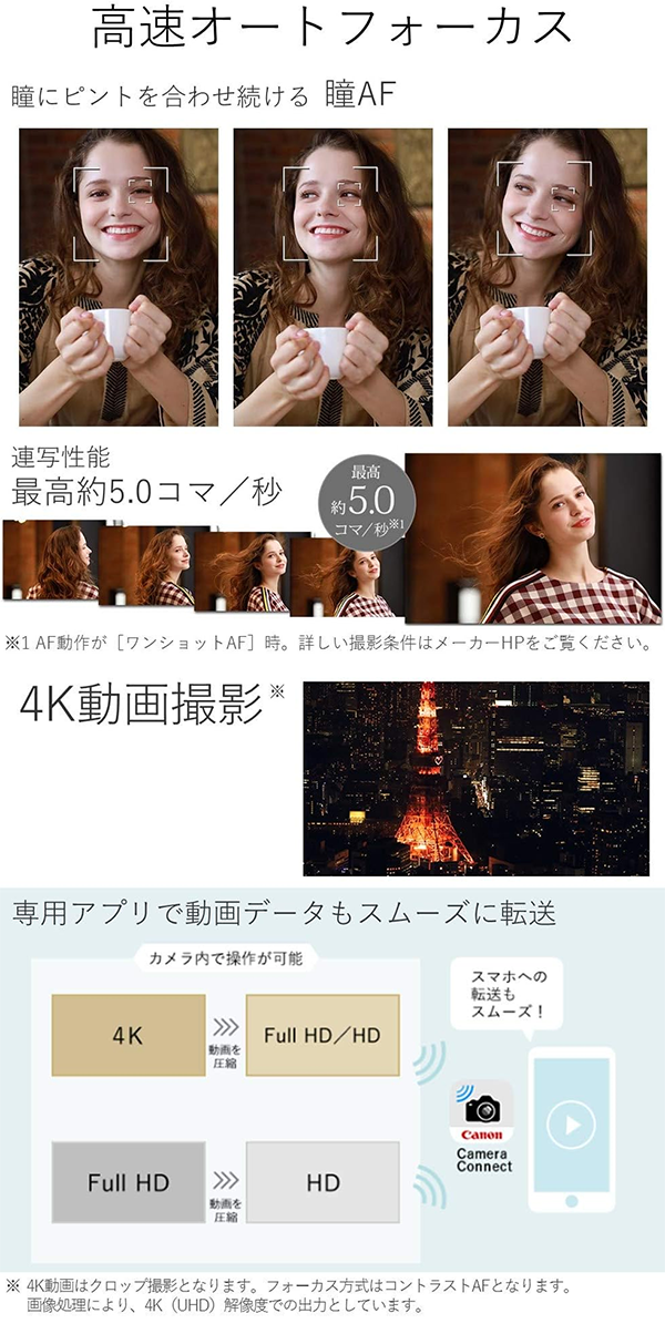 - 高画質フルサイズ: 約2620万画素の35mmフルサイズCMOSセンサーを搭載。背景を美しくぼかした表現や、暗い場所でのノイズを抑えた撮影が可能です。