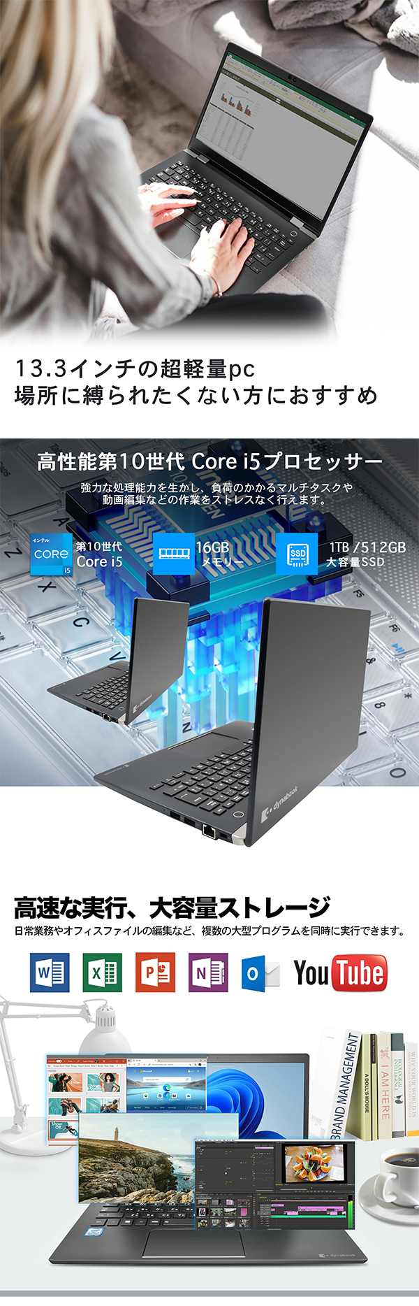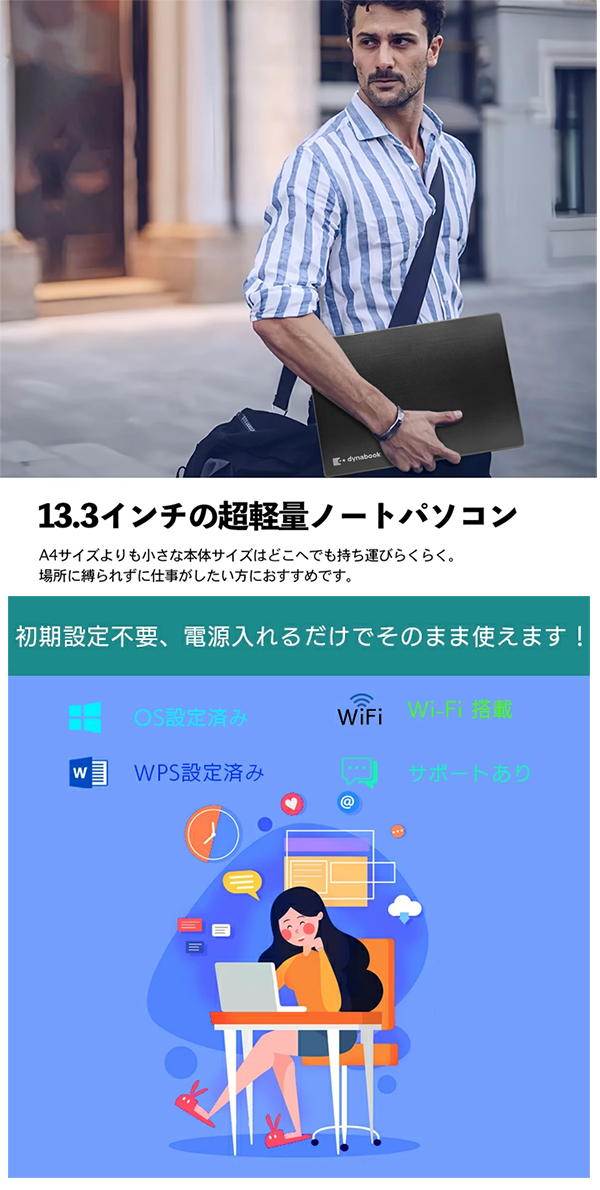 - 持ち運びやすい13.3インチのコンパクトサイズ&軽量設計で、バッグにもすっきり収納可能。出張先や通学時、カフェでの作業など、さまざまなシーンで活躍する、携帯性に優れた小型ノートパソコンです。