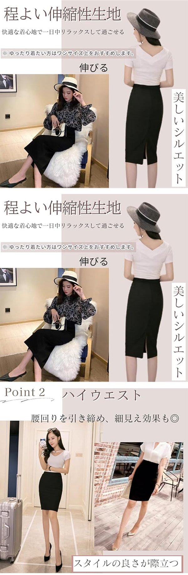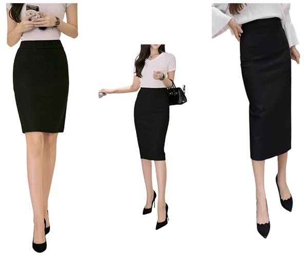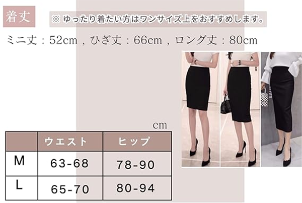 ▶ 細見え効果抜群のタイトスカート。ミニ丈、ひざ丈、ロング丈の3種類。