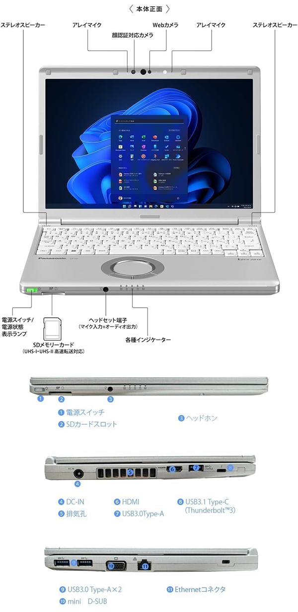 - ポート: Thunderbolt 4 / USB 3.1 Type-C ×1 (PD対応) USB 3.0 Type-A ×3 HDMI出力 / アナログRGB (VGA) SDカードスロット (SDXC対応) Webカメラ: 顔認証対応IRカメラ内蔵 (有効画素数:最大1920×1080ピクセル)