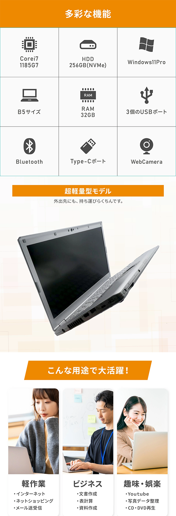 - 11世代のCore i7-1185G7と32GBのメモリを搭載しており、負荷の高いマルチタスクやビジネス用途に適したスペックです。
