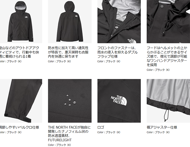 - ナノレベルのポリウレタン繊維をミクロ単位で吹き重ねてシート状にした、THE NORTH FACEが独自に開発したナノフィルム状の防水透湿素材、FUTURELIGHTを採用したレインジャケット。
